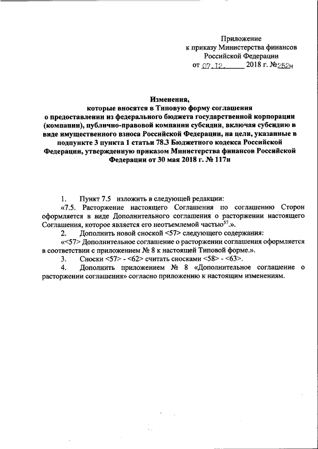 "О ВНЕСЕНИИ ИЗМЕНЕНИЙ В ТИПОВУЮ ФОРМУ СОГЛАШЕНИЯ О ПРЕДОСТАВЛЕНИИ ИЗ ФЕДЕРАЛЬНОГО БЮДЖЕТА ГОСУДАРСТВЕННОЙ КОРПОРАЦИИ (КОМПАНИИ), ПУБЛИЧНО - ПРАВОВОЙ КОМПАНИИ СУБСИДИИ, ВКЛЮЧАЯ СУБСИДИЮ В ВИДЕ ИМУЩЕСТВЕННОГО ВЗНОСА РОССИЙСКОЙ ФЕДЕРАЦИИ, НА ЦЕЛИ, УКАЗАННЫЕ В ПОДПУНКТЕ 3 ПУНКТА 1 СТАТЬИ 78.3 БЮДЖЕТНОГО КОДЕКСА РОССИЙСКОЙ ФЕДЕРАЦИИ, УТВЕРЖДЕННУЮ ПРИКАЗОМ МИНИСТЕРСТВА ФИНАНСОВ РОССИЙСКОЙ ФЕДЕРАЦИИ ОТ 30 МАЯ 2018 Г. N 117Н"