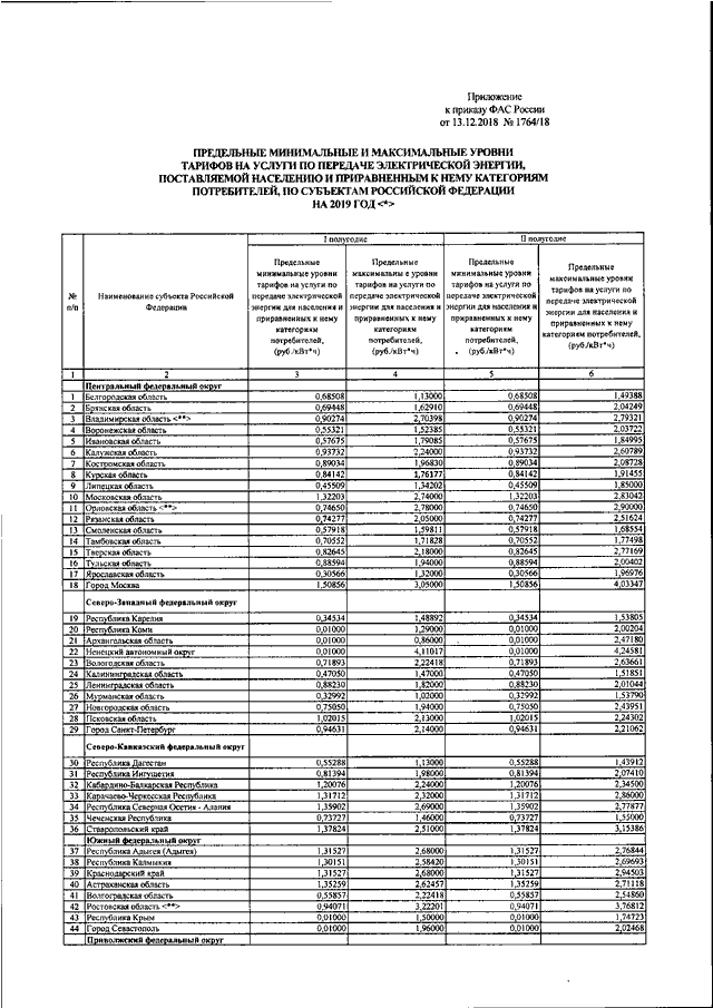 "ОБ УТВЕРЖДЕНИИ ПРЕДЕЛЬНЫХ МИНИМАЛЬНЫХ И МАКСИМАЛЬНЫХ УРОВНЕЙ ТАРИФОВ НА УСЛУГИ ПО ПЕРЕДАЧЕ ЭЛЕКТРИЧЕСКОЙ ЭНЕРГИИ, ПОСТАВЛЯЕМОЙ НАСЕЛЕНИЮ И ПРИРАВНЕННЫМ К НЕМУ КАТЕГОРИЯМ ПОТРЕБИТЕЛЕЙ, ПО СУБЪЕКТАМ РОССИЙСКОЙ ФЕДЕРАЦИИ НА 2019 ГОД"