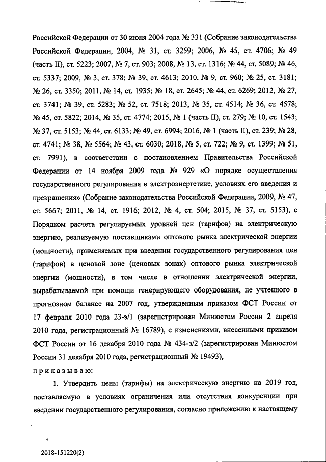"ОБ УТВЕРЖДЕНИИ ЦЕН (ТАРИФОВ) НА ЭЛЕКТРИЧЕСКУЮ ЭНЕРГИЮ НА 2019 ГОД, ПОСТАВЛЯЕМУЮ В УСЛОВИЯХ ОГРАНИЧЕНИЯ ИЛИ ОТСУТСТВИЯ КОНКУРЕНЦИИ ПРИ ВВЕДЕНИИ ГОСУДАРСТВЕННОГО РЕГУЛИРОВАНИЯ"