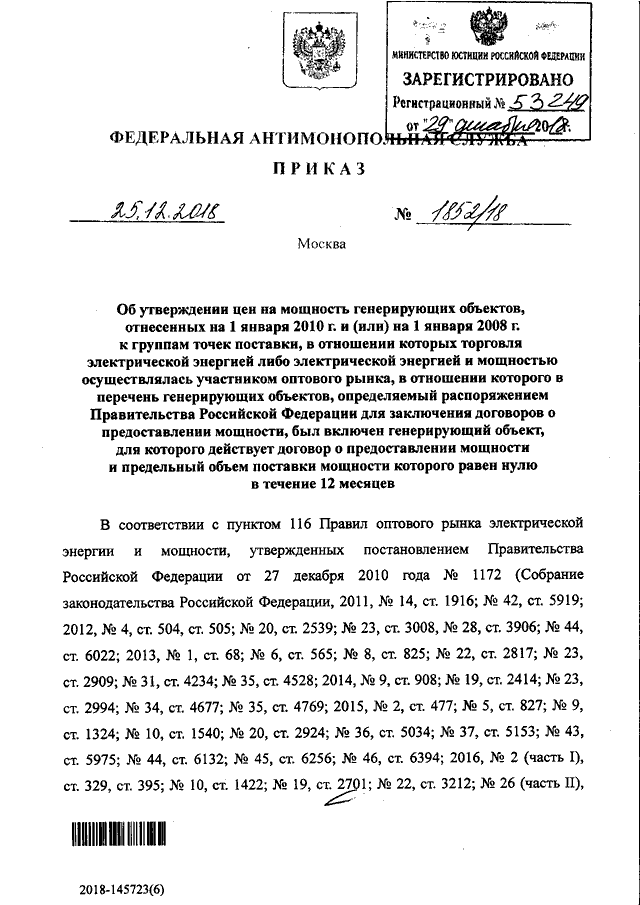 ПРИКАЗ Федеральной антимонопольной службы от 25.12.2018 N 1852/18