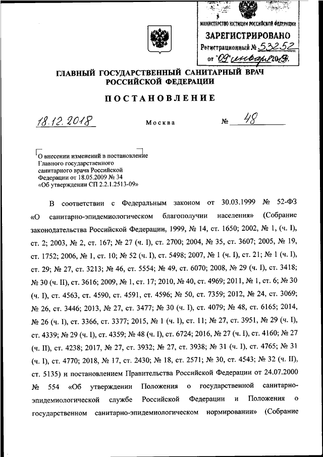 ПОСТАНОВЛЕНИЕ Главного государственного санитарного врача РФ от 18.12.2018 N 48