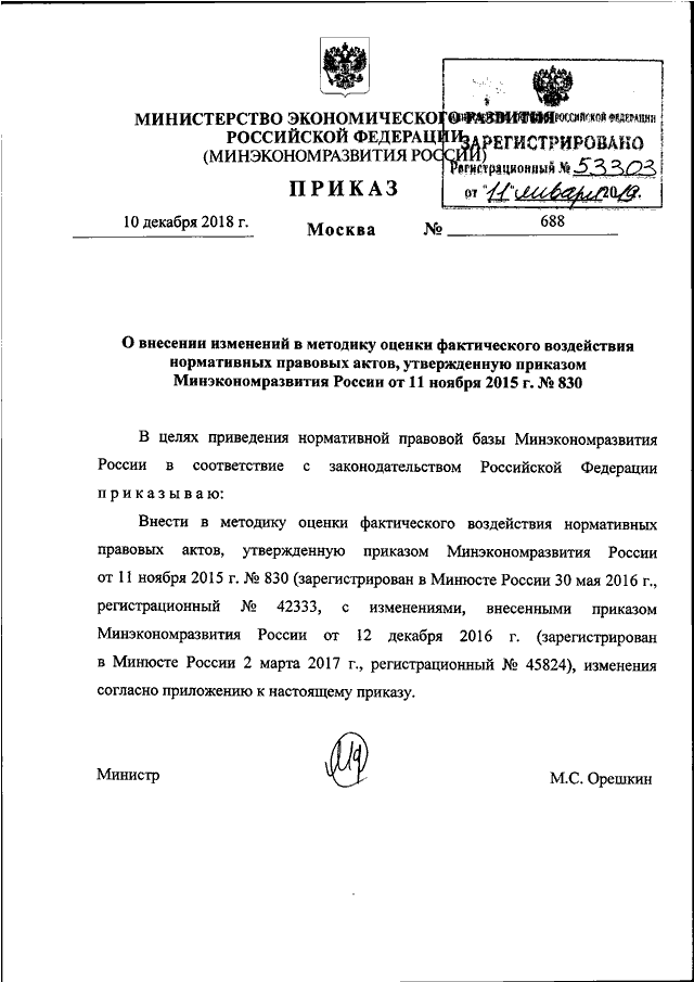 ПРИКАЗ Минэкономразвития РФ от 10.12.2018 N 688
