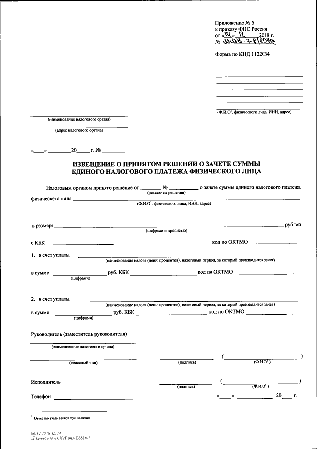 "ОБ УТВЕРЖДЕНИИ ФОРМ ДОКУМЕНТОВ, ИСПОЛЬЗУЕМЫХ НАЛОГОВЫМИ ОРГАНАМИ ПРИ ОСУЩЕСТВЛЕНИИ ЗАЧЕТА И ВОЗВРАТА СУММЫ ЕДИНОГО НАЛОГОВОГО ПЛАТЕЖА ФИЗИЧЕСКОГО ЛИЦА И ФОРМАТА ПРЕДСТАВЛЕНИЯ ЗАЯВЛЕНИЯ О ВОЗВРАТЕ ДЕНЕЖНЫХ СРЕДСТВ, ПЕРЕЧИСЛЕННЫХ В БЮДЖЕТНУЮ СИСТЕМУ РОССИЙСКОЙ ФЕДЕРАЦИИ В КАЧЕСТВЕ ЕДИНОГО НАЛОГОВОГО ПЛАТЕЖА ФИЗИЧЕСКОГО ЛИЦА, В ЭЛЕКТРОННОЙ ФОРМЕ"