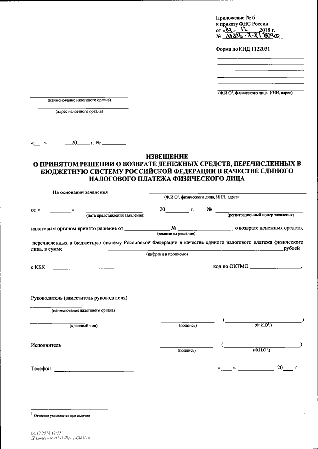"ОБ УТВЕРЖДЕНИИ ФОРМ ДОКУМЕНТОВ, ИСПОЛЬЗУЕМЫХ НАЛОГОВЫМИ ОРГАНАМИ ПРИ ОСУЩЕСТВЛЕНИИ ЗАЧЕТА И ВОЗВРАТА СУММЫ ЕДИНОГО НАЛОГОВОГО ПЛАТЕЖА ФИЗИЧЕСКОГО ЛИЦА И ФОРМАТА ПРЕДСТАВЛЕНИЯ ЗАЯВЛЕНИЯ О ВОЗВРАТЕ ДЕНЕЖНЫХ СРЕДСТВ, ПЕРЕЧИСЛЕННЫХ В БЮДЖЕТНУЮ СИСТЕМУ РОССИЙСКОЙ ФЕДЕРАЦИИ В КАЧЕСТВЕ ЕДИНОГО НАЛОГОВОГО ПЛАТЕЖА ФИЗИЧЕСКОГО ЛИЦА, В ЭЛЕКТРОННОЙ ФОРМЕ"