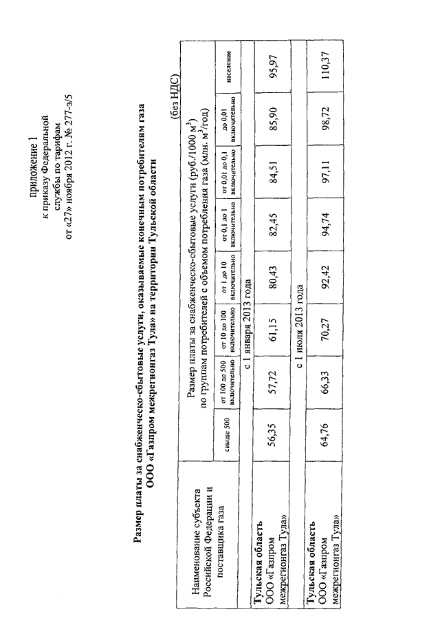 "ОБ УТВЕРЖДЕНИИ РАЗМЕРА ПЛАТЫ ЗА СНАБЖЕНЧЕСКО - СБЫТОВЫЕ УСЛУГИ, ОКАЗЫВАЕМЫЕ КОНЕЧНЫМ ПОТРЕБИТЕЛЯМ ГАЗА ООО "ГАЗПРОМ МЕЖРЕГИОНГАЗ ТУЛА", И ТАРИФОВ НА УСЛУГИ ПО ТРАНСПОРТИРОВКЕ ГАЗА ПО ГАЗОРАСПРЕДЕЛИТЕЛЬНЫМ СЕТЯМ ЗАО "ТУЛАГОРГАЗ" И ОАО "ТУЛАОБЛГАЗ" НА ТЕРРИТОРИИ ТУЛЬСКОЙ ОБЛАСТИ"