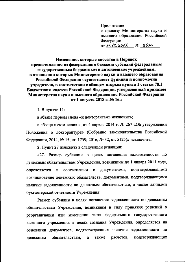 "О ВНЕСЕНИИ ИЗМЕНЕНИЙ В ПОРЯДОК ПРЕДОСТАВЛЕНИЯ ИЗ ФЕДЕРАЛЬНОГО БЮДЖЕТА СУБСИДИЙ ФЕДЕРАЛЬНЫМ ГОСУДАРСТВЕННЫМ БЮДЖЕТНЫМ И АВТОНОМНЫМ УЧРЕЖДЕНИЯМ, В ОТНОШЕНИИ КОТОРЫХ МИНИСТЕРСТВО НАУКИ И ВЫСШЕГО ОБРАЗОВАНИЯ РОССИЙСКОЙ ФЕДЕРАЦИИ ОСУЩЕСТВЛЯЕТ ФУНКЦИИ И ПОЛНОМОЧИЯ УЧРЕДИТЕЛЯ, В СООТВЕТСТВИИ С АБЗАЦЕМ ВТОРЫМ ПУНКТА 1 СТАТЬИ 78.1 БЮДЖЕТНОГО КОДЕКСА РОССИЙСКОЙ ФЕДЕРАЦИИ, УТВЕРЖДЕННЫЙ ПРИКАЗОМ МИНИСТЕРСТВА НАУКИ И ВЫСШЕГО ОБРАЗОВАНИЯ РОССИЙСКОЙ ФЕДЕРАЦИИ ОТ 1 АВГУСТА 2018 Г. N 16Н"