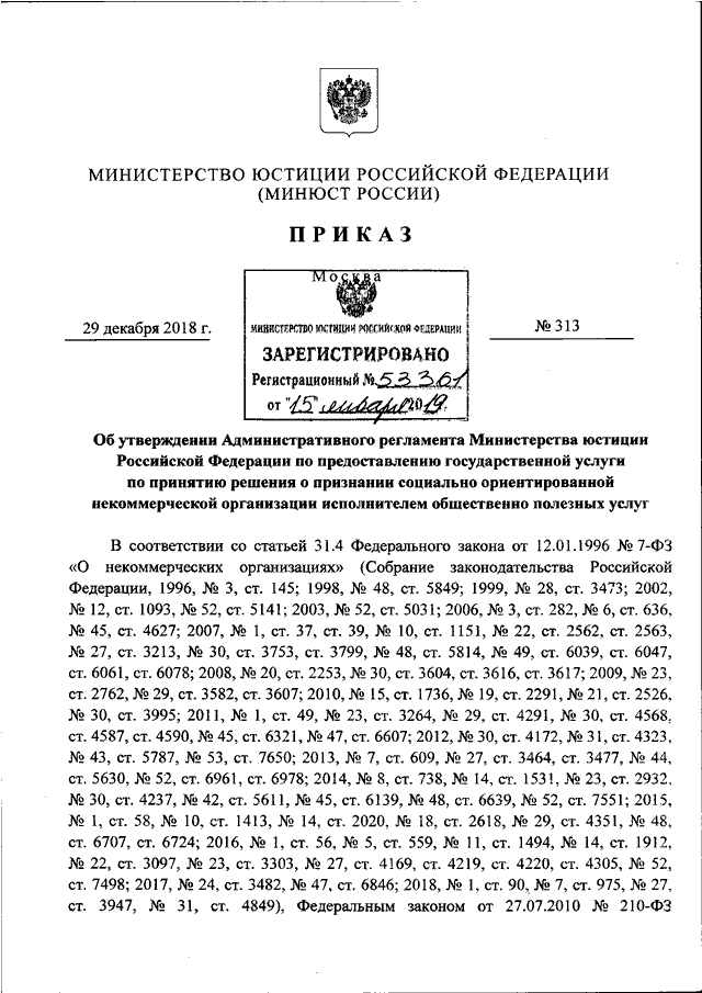 ПРИКАЗ Минюста РФ от 29.12.2018 N 313