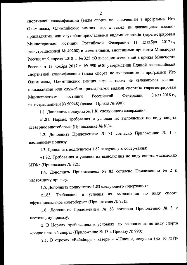 "О ВНЕСЕНИИ ИЗМЕНЕНИЙ В ПРИКАЗ МИНСПОРТА РОССИИ ОТ 13 НОЯБРЯ 2017 Г. N 990 "ОБ УТВЕРЖДЕНИИ ЕДИНОЙ ВСЕРОССИЙСКОЙ СПОРТИВНОЙ КЛАССИФИКАЦИИ (ВИДЫ СПОРТА НЕ ВКЛЮЧЕННЫЕ В ПРОГРАММЫ ИГР ОЛИМПИАДЫ, ОЛИМПИЙСКИХ ЗИМНИХ ИГР, А ТАКЖЕ НЕ ЯВЛЯЮЩИЕСЯ ВОЕННО - ПРИКЛАДНЫМИ ИЛИ СЛУЖЕБНО - ПРИКЛАДНЫМИ ВИДАМИ СПОРТА)"