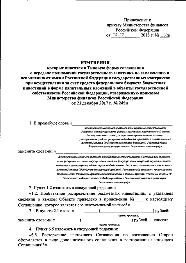 "О ВНЕСЕНИИ ИЗМЕНЕНИЙ В ТИПОВУЮ ФОРМУ СОГЛАШЕНИЯ О ПЕРЕДАЧЕ ПОЛНОМОЧИЙ ГОСУДАРСТВЕННОГО ЗАКАЗЧИКА ПО ЗАКЛЮЧЕНИЮ И ИСПОЛНЕНИЮ ОТ ИМЕНИ РОССИЙСКОЙ ФЕДЕРАЦИИ ГОСУДАРСТВЕННЫХ КОНТРАКТОВ ПРИ ОСУЩЕСТВЛЕНИИ ЗА СЧЕТ СРЕДСТВ ФЕДЕРАЛЬНОГО БЮДЖЕТА БЮДЖЕТНЫХ ИНВЕСТИЦИЙ В ФОРМЕ КАПИТАЛЬНЫХ ВЛОЖЕНИЙ В ОБЪЕКТЫ ГОСУДАРСТВЕННОЙ СОБСТВЕННОСТИ РОССИЙСКОЙ ФЕДЕРАЦИИ, УТВЕРЖДЕННУЮ ПРИКАЗОМ МИНИСТЕРСТВА ФИНАНСОВ РОССИЙСКОЙ ФЕДЕРАЦИИ ОТ 21 ДЕКАБРЯ 2017 Г. N 245Н"