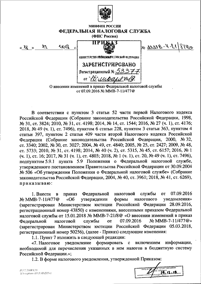 "О ВНЕСЕНИИ ИЗМЕНЕНИЙ В ПРИКАЗ ФЕДЕРАЛЬНОЙ НАЛОГОВОЙ СЛУЖБЫ ОТ 07.09.2016 N ММВ-7-11/477@"