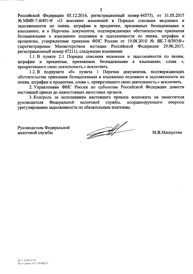 "О ВНЕСЕНИИ ИЗМЕНЕНИЙ В ПОРЯДОК СПИСАНИЯ НЕДОИМКИ И ЗАДОЛЖЕННОСТИ