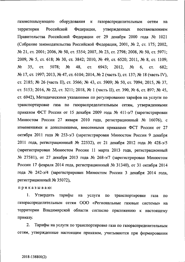 "ОБ УТВЕРЖДЕНИИ ТАРИФОВ НА УСЛУГИ ПО ТРАНСПОРТИРОВКЕ ГАЗА ПО ГАЗОРАСПРЕДЕЛИТЕЛЬНЫМ СЕТЯМ ООО "РЕГИОНАЛЬНЫЕ ГАЗОВЫЕ СИСТЕМЫ" НА ТЕРРИТОРИИ ВЛАДИМИРСКОЙ ОБЛАСТИ"