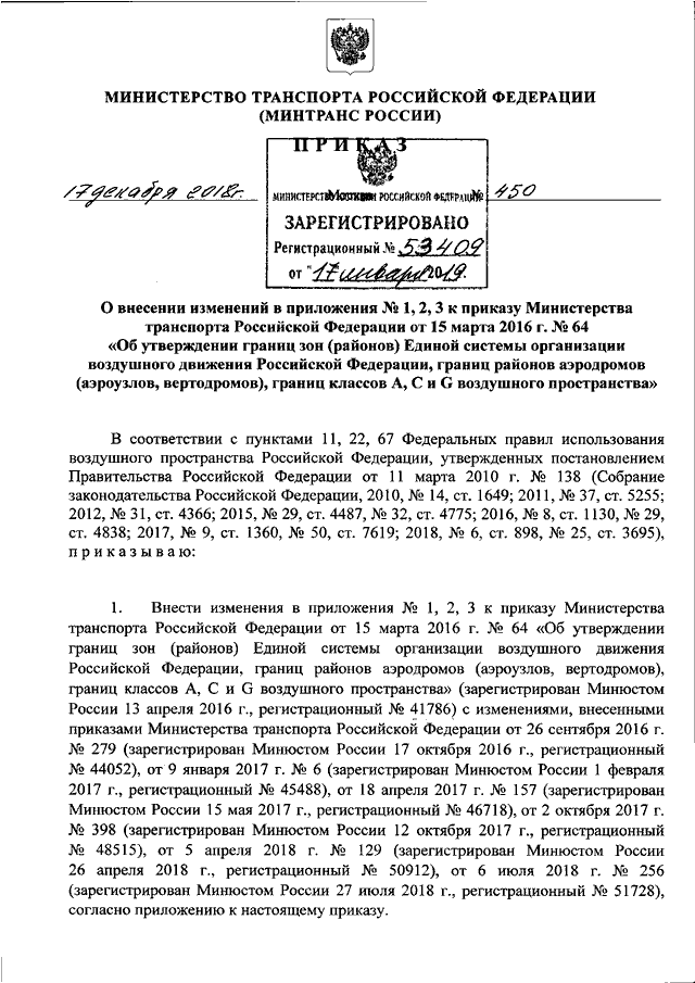 "О ВНЕСЕНИИ ИЗМЕНЕНИЙ В ПРИЛОЖЕНИЯ N 1, 2, 3 К ПРИКАЗУ МИНИСТЕРСТВА ТРАНСПОРТА РОССИЙСКОЙ ФЕДЕРАЦИИ ОТ 15 МАРТА 2016 Г. N 64 "ОБ УТВЕРЖДЕНИИ ГРАНИЦ ЗОН (РАЙОНОВ) ЕДИНОЙ СИСТЕМЫ ОРГАНИЗАЦИИ ВОЗДУШНОГО ДВИЖЕНИЯ РОССИЙСКОЙ ФЕДЕРАЦИИ, ГРАНИЦ РАЙОНОВ АЭРОДРОМОВ (АЭРОУЗЛОВ, ВЕРТОДРОМОВ), ГРАНИЦ КЛАССОВ A, C И G ВОЗДУШНОГО ПРОСТРАНСТВА"