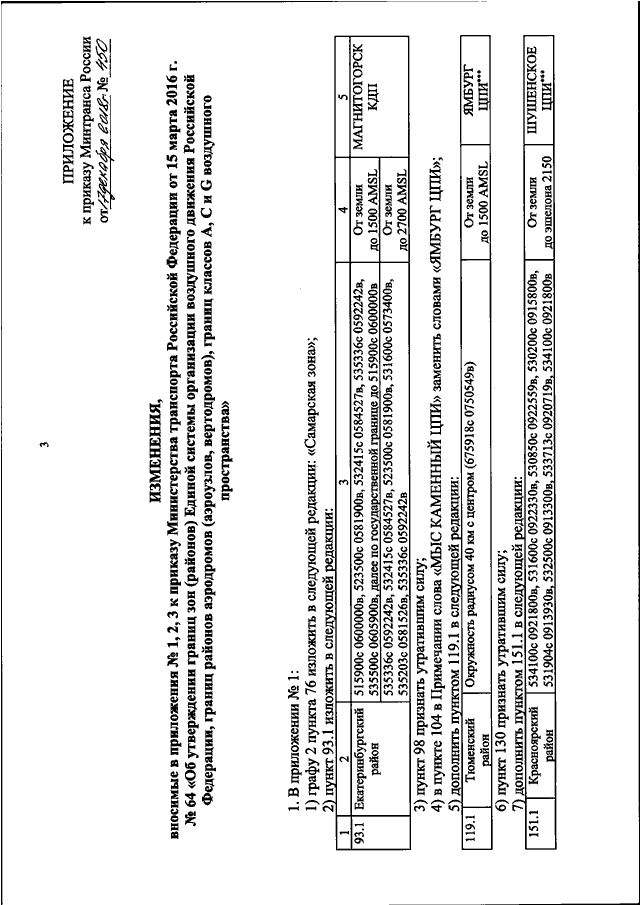 "О ВНЕСЕНИИ ИЗМЕНЕНИЙ В ПРИЛОЖЕНИЯ N 1, 2, 3 К ПРИКАЗУ МИНИСТЕРСТВА ТРАНСПОРТА РОССИЙСКОЙ ФЕДЕРАЦИИ ОТ 15 МАРТА 2016 Г. N 64 "ОБ УТВЕРЖДЕНИИ ГРАНИЦ ЗОН (РАЙОНОВ) ЕДИНОЙ СИСТЕМЫ ОРГАНИЗАЦИИ ВОЗДУШНОГО ДВИЖЕНИЯ РОССИЙСКОЙ ФЕДЕРАЦИИ, ГРАНИЦ РАЙОНОВ АЭРОДРОМОВ (АЭРОУЗЛОВ, ВЕРТОДРОМОВ), ГРАНИЦ КЛАССОВ A, C И G ВОЗДУШНОГО ПРОСТРАНСТВА"