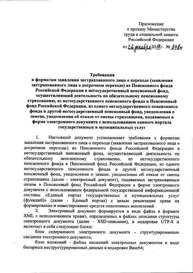 "ОБ УТВЕРЖДЕНИИ ТРЕБОВАНИЙ К ФОРМАТАМ ЗАЯВЛЕНИЯ ЗАСТРАХОВАННОГО ЛИЦА О ПЕРЕХОДЕ (ЗАЯВЛЕНИЯ ЗАСТРАХОВАННОГО ЛИЦА О ДОСРОЧНОМ ПЕРЕХОДЕ) ИЗ ПЕНСИОННОГО ФОНДА РОССИЙСКОЙ ФЕДЕРАЦИИ В НЕГОСУДАРСТВЕННЫЙ ПЕНСИОННЫЙ ФОНД, ОСУЩЕСТВЛЯЮЩИЙ ДЕЯТЕЛЬНОСТЬ ПО ОБЯЗАТЕЛЬНОМУ ПЕНСИОННОМУ СТРАХОВАНИЮ, ИЗ НЕГОСУДАРСТВЕННОГО ПЕНСИОННОГО ФОНДА В ПЕНСИОННЫЙ ФОНД РОССИЙСКОЙ ФЕДЕРАЦИИ, ИЗ ОДНОГО НЕГОСУДАРСТВЕННОГО ПЕНСИОННОГО ФОНДА В ДРУГОЙ НЕГОСУДАРСТВЕННЫЙ ПЕНСИОННЫЙ ФОНД, УВЕДОМЛЕНИЯ О ЗАМЕНЕ, УВЕДОМЛЕНИЯ ОБ ОТКАЗЕ ОТ СМЕНЫ СТРАХОВЩИКА, ПОДАВАЕМЫХ В ФОРМЕ ЭЛЕКТРОННОГО ДОКУМЕНТА С ИСПОЛЬЗОВАНИЕМ ЕДИНОГО ПОРТАЛА ГОСУДАРСТВЕННЫХ И МУНИЦИПАЛЬНЫХ УСЛУГ"