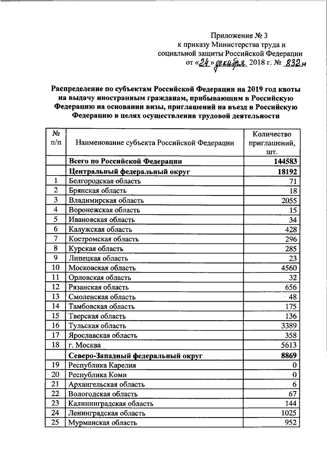 "О РАСПРЕДЕЛЕНИИ ПО СУБЪЕКТАМ РОССИЙСКОЙ ФЕДЕРАЦИИ УТВЕРЖДЕННЫХ ПРАВИТЕЛЬСТВОМ РОССИЙСКОЙ ФЕДЕРАЦИИ НА 2019 ГОД КВОТ НА ВЫДАЧУ ИНОСТРАННЫМ ГРАЖДАНАМ, ПРИБЫВАЮЩИМ В РОССИЙСКУЮ ФЕДЕРАЦИЮ НА ОСНОВАНИИ ВИЗЫ, РАЗРЕШЕНИЙ НА РАБОТУ И ПРИГЛАШЕНИЙ НА ВЪЕЗД В РОССИЙСКУЮ ФЕДЕРАЦИЮ В ЦЕЛЯХ ОСУЩЕСТВЛЕНИЯ ТРУДОВОЙ ДЕЯТЕЛЬНОСТИ"