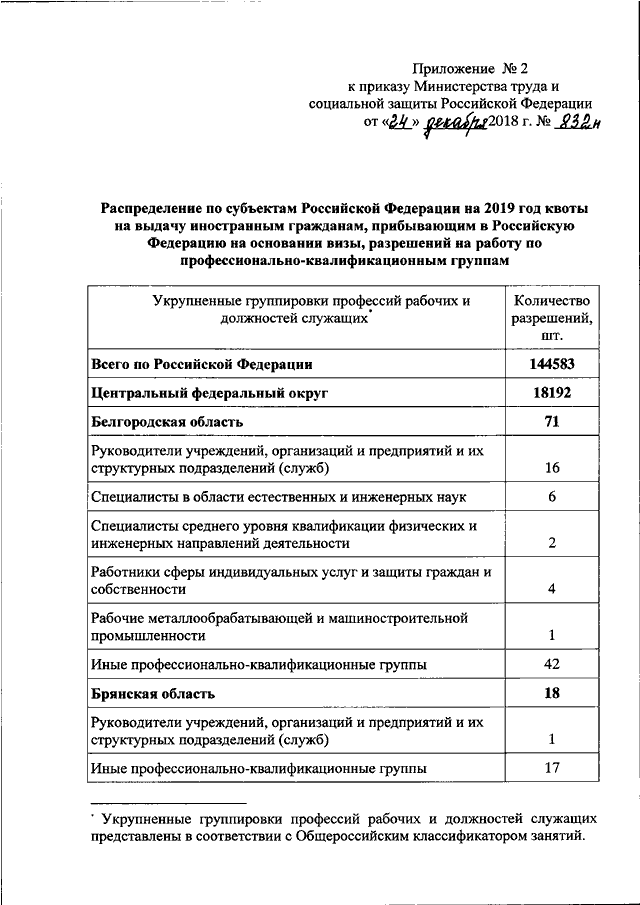 "О РАСПРЕДЕЛЕНИИ ПО СУБЪЕКТАМ РОССИЙСКОЙ ФЕДЕРАЦИИ УТВЕРЖДЕННЫХ ПРАВИТЕЛЬСТВОМ РОССИЙСКОЙ ФЕДЕРАЦИИ НА 2019 ГОД КВОТ НА ВЫДАЧУ ИНОСТРАННЫМ ГРАЖДАНАМ, ПРИБЫВАЮЩИМ В РОССИЙСКУЮ ФЕДЕРАЦИЮ НА ОСНОВАНИИ ВИЗЫ, РАЗРЕШЕНИЙ НА РАБОТУ И ПРИГЛАШЕНИЙ НА ВЪЕЗД В РОССИЙСКУЮ ФЕДЕРАЦИЮ В ЦЕЛЯХ ОСУЩЕСТВЛЕНИЯ ТРУДОВОЙ ДЕЯТЕЛЬНОСТИ"
