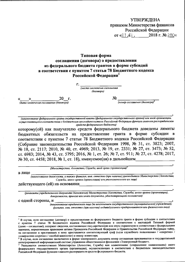 "ОБ УТВЕРЖДЕНИИ ТИПОВЫХ ФОРМ СОГЛАШЕНИЙ (ДОГОВОРОВ) О ПРЕДОСТАВЛЕНИИ ИЗ ФЕДЕРАЛЬНОГО БЮДЖЕТА ГРАНТОВ В ФОРМЕ СУБСИДИЙ В СООТВЕТСТВИИ С ПУНКТОМ 7 СТАТЬИ 78 И ПУНКТОМ 4 СТАТЬИ 78.1 БЮДЖЕТНОГО КОДЕКСА РОССИЙСКОЙ ФЕДЕРАЦИИ"