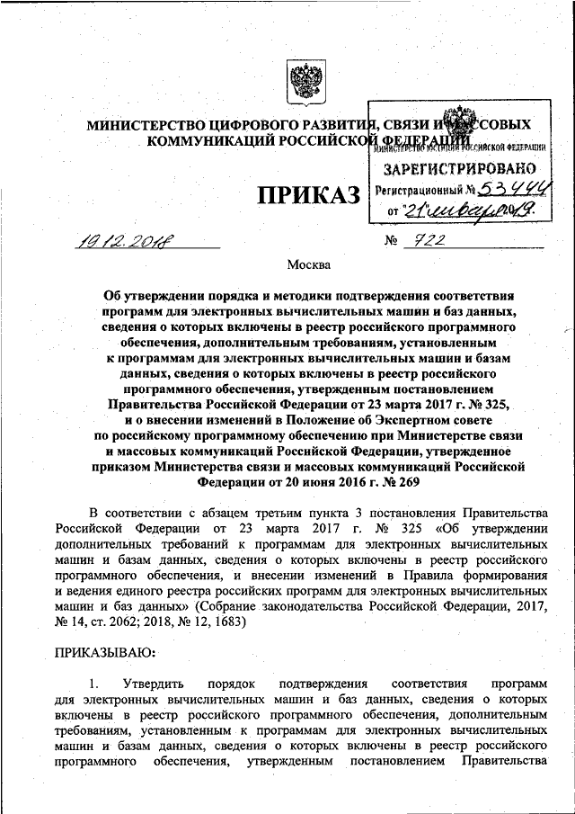 ПРИКАЗ Минкомсвязи РФ от 19.12.2018 N 722