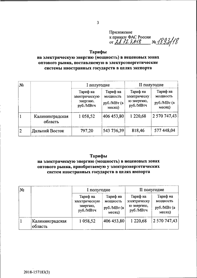 "ОБ УТВЕРЖДЕНИИ НА 2019 ГОД ТАРИФОВ НА ЭЛЕКТРИЧЕСКУЮ ЭНЕРГИЮ (МОЩНОСТЬ) В НЕЦЕНОВЫХ ЗОНАХ ОПТОВОГО РЫНКА, ПОСТАВЛЯЕМУЮ В ЭЛЕКТРОЭНЕРГЕТИЧЕСКИЕ СИСТЕМЫ ИНОСТРАННЫХ ГОСУДАРСТВ И ПРИОБРЕТАЕМУЮ У НИХ В ЦЕЛЯХ ЭКСПОРТА ИЛИ ИМПОРТА"