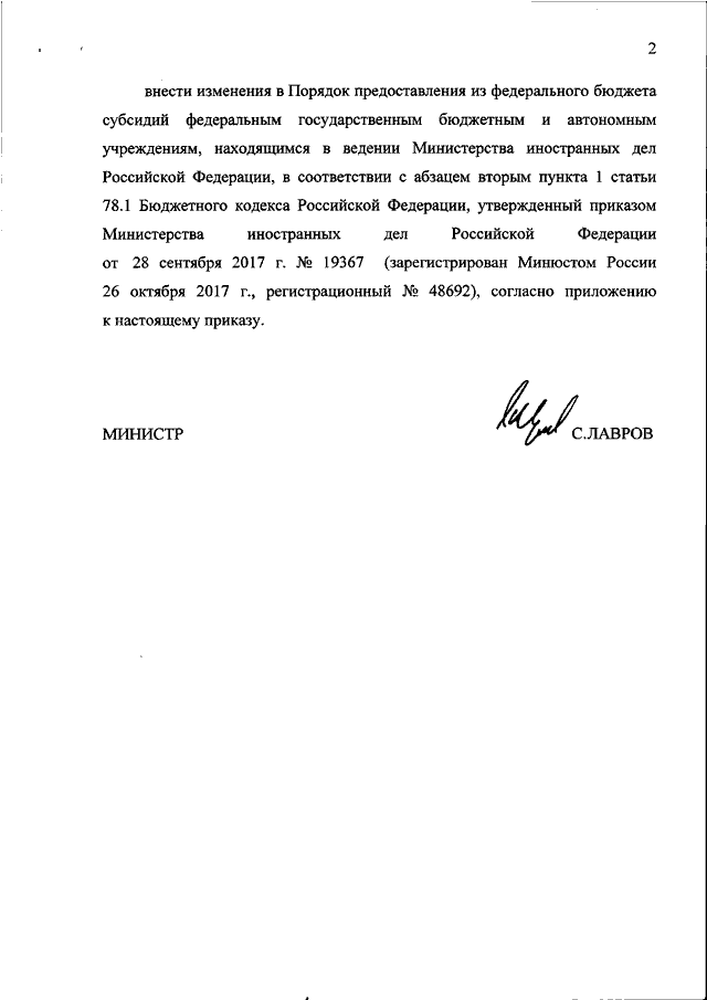 "О ВНЕСЕНИИ ИЗМЕНЕНИЙ В ПОРЯДОК ПРЕДОСТАВЛЕНИЯ ИЗ ФЕДЕРАЛЬНОГО БЮДЖЕТА СУБСИДИЙ ФЕДЕРАЛЬНЫМ ГОСУДАРСТВЕННЫМ БЮДЖЕТНЫМ И АВТОНОМНЫМ УЧРЕЖДЕНИЯМ, НАХОДЯЩИМСЯ В ВЕДЕНИИ МИНИСТЕРСТВА ИНОСТРАННЫХ ДЕЛ РОССИЙСКОЙ ФЕДЕРАЦИИ, В СООТВЕТСТВИИ С АБЗАЦЕМ ВТОРЫМ ПУНКТА 1 СТАТЬИ 78.1 БЮДЖЕТНОГО КОДЕКСА РОССИЙСКОЙ ФЕДЕРАЦИИ, УТВЕРЖДЕННЫЙ ПРИКАЗОМ МИНИСТЕРСТВА ИНОСТРАННЫХ ДЕЛ РОССИЙСКОЙ ФЕДЕРАЦИИ ОТ 28 СЕНТЯБРЯ 2017 Г. N 19367"