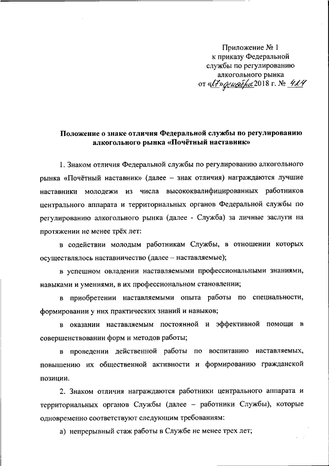 "ОБ УЧРЕЖДЕНИИ ЗНАКА ОТЛИЧИЯ ФЕДЕРАЛЬНОЙ СЛУЖБЫ ПО РЕГУЛИРОВАНИЮ АЛКОГОЛЬНОГО РЫНКА "ПОЧЕТНЫЙ НАСТАВНИК"