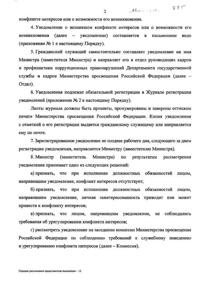 "О ПОРЯДКЕ УВЕДОМЛЕНИЯ ПРЕДСТАВИТЕЛЯ НАНИМАТЕЛЯ ФЕДЕРАЛЬНЫМИ ГОСУДАРСТВЕННЫМИ ГРАЖДАНСКИМИ СЛУЖАЩИМИ МИНИСТЕРСТВА ПРОСВЕЩЕНИЯ РОССИЙСКОЙ ФЕДЕРАЦИИ О ВОЗНИКНОВЕНИИ ЛИЧНОЙ ЗАИНТЕРЕСОВАННОСТИ ПРИ ИСПОЛНЕНИИ ДОЛЖНОСТНЫХ ОБЯЗАННОСТЕЙ, КОТОРАЯ ПРИВОДИТ ИЛИ МОЖЕТ ПРИВЕСТИ К КОНФЛИКТУ ИНТЕРЕСОВ"
