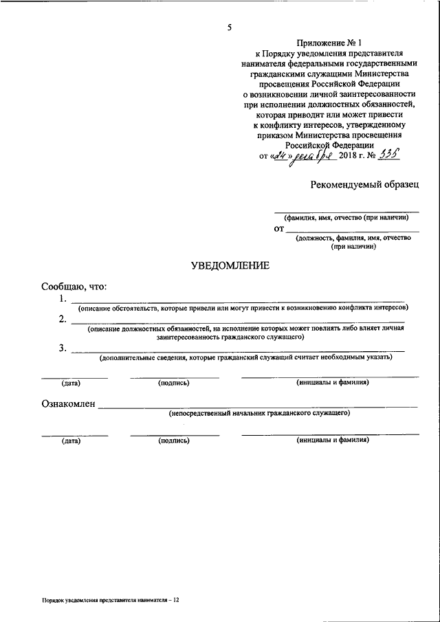 "О ПОРЯДКЕ УВЕДОМЛЕНИЯ ПРЕДСТАВИТЕЛЯ НАНИМАТЕЛЯ ФЕДЕРАЛЬНЫМИ ГОСУДАРСТВЕННЫМИ ГРАЖДАНСКИМИ СЛУЖАЩИМИ МИНИСТЕРСТВА ПРОСВЕЩЕНИЯ РОССИЙСКОЙ ФЕДЕРАЦИИ О ВОЗНИКНОВЕНИИ ЛИЧНОЙ ЗАИНТЕРЕСОВАННОСТИ ПРИ ИСПОЛНЕНИИ ДОЛЖНОСТНЫХ ОБЯЗАННОСТЕЙ, КОТОРАЯ ПРИВОДИТ ИЛИ МОЖЕТ ПРИВЕСТИ К КОНФЛИКТУ ИНТЕРЕСОВ"