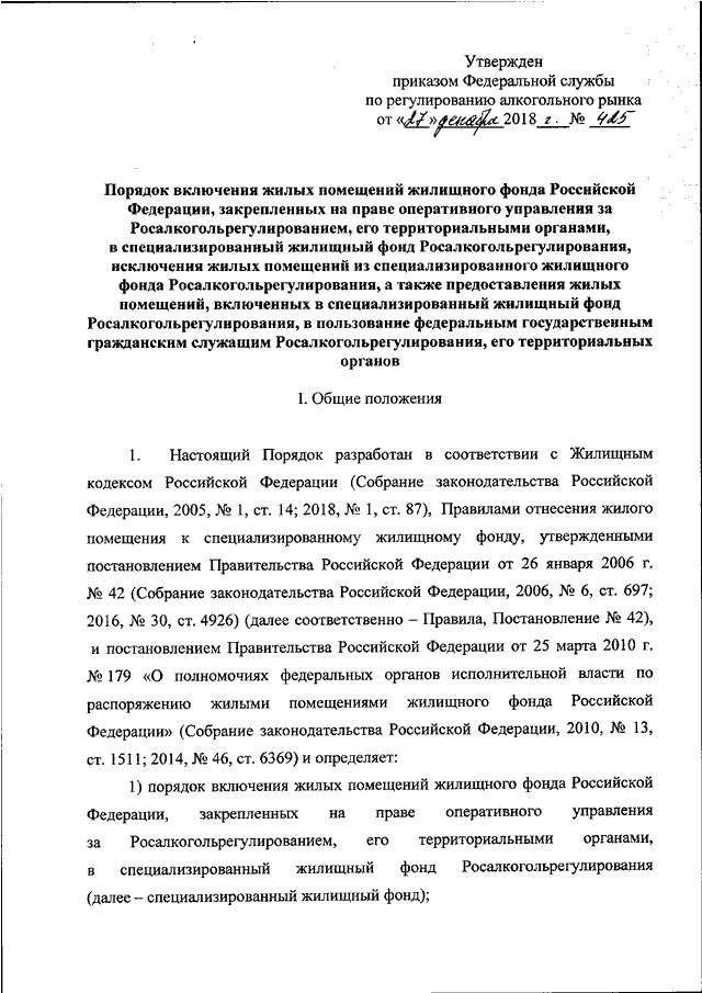 "ОБ УТВЕРЖДЕНИИ ПОРЯДКА ВКЛЮЧЕНИЯ ЖИЛЫХ ПОМЕЩЕНИЙ ЖИЛИЩНОГО ФОНДА РОССИЙСКОЙ ФЕДЕРАЦИИ, ЗАКРЕПЛЕННЫХ НА ПРАВЕ ОПЕРАТИВНОГО УПРАВЛЕНИЯ ЗА РОСАЛКОГОЛЬРЕГУЛИРОВАНИЕМ, ЕГО ТЕРРИТОРИАЛЬНЫМИ ОРГАНАМИ, В СПЕЦИАЛИЗИРОВАННЫЙ ЖИЛИЩНЫЙ ФОНД РОСАЛКОГОЛЬРЕГУЛИРОВАНИЯ, ИСКЛЮЧЕНИЯ ЖИЛЫХ ПОМЕЩЕНИЙ ИЗ СПЕЦИАЛИЗИРОВАННОГО ЖИЛИЩНОГО ФОНДА РОСАЛКОГОЛЬРЕГУЛИРОВАНИЯ, А ТАКЖЕ ПРЕДОСТАВЛЕНИЯ ЖИЛЫХ ПОМЕЩЕНИЙ, ВКЛЮЧЕННЫХ В СПЕЦИАЛИЗИРОВАННЫЙ ЖИЛИЩНЫЙ ФОНД РОСАЛКОГОЛЬРЕГУЛИРОВАНИЯ, В ПОЛЬЗОВАНИЕ ФЕДЕРАЛЬНЫМ ГОСУДАРСТВЕННЫМ ГРАЖДАНСКИМ СЛУЖАЩИМ РОСАЛКОГОЛЬРЕГУЛИРОВАНИЯ, ЕГО ТЕРРИТОРИАЛЬНЫХ ОРГАНОВ"