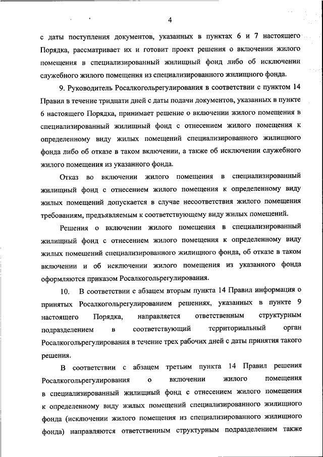 "ОБ УТВЕРЖДЕНИИ ПОРЯДКА ВКЛЮЧЕНИЯ ЖИЛЫХ ПОМЕЩЕНИЙ ЖИЛИЩНОГО ФОНДА РОССИЙСКОЙ ФЕДЕРАЦИИ, ЗАКРЕПЛЕННЫХ НА ПРАВЕ ОПЕРАТИВНОГО УПРАВЛЕНИЯ ЗА РОСАЛКОГОЛЬРЕГУЛИРОВАНИЕМ, ЕГО ТЕРРИТОРИАЛЬНЫМИ ОРГАНАМИ, В СПЕЦИАЛИЗИРОВАННЫЙ ЖИЛИЩНЫЙ ФОНД РОСАЛКОГОЛЬРЕГУЛИРОВАНИЯ, ИСКЛЮЧЕНИЯ ЖИЛЫХ ПОМЕЩЕНИЙ ИЗ СПЕЦИАЛИЗИРОВАННОГО ЖИЛИЩНОГО ФОНДА РОСАЛКОГОЛЬРЕГУЛИРОВАНИЯ, А ТАКЖЕ ПРЕДОСТАВЛЕНИЯ ЖИЛЫХ ПОМЕЩЕНИЙ, ВКЛЮЧЕННЫХ В СПЕЦИАЛИЗИРОВАННЫЙ ЖИЛИЩНЫЙ ФОНД РОСАЛКОГОЛЬРЕГУЛИРОВАНИЯ, В ПОЛЬЗОВАНИЕ ФЕДЕРАЛЬНЫМ ГОСУДАРСТВЕННЫМ ГРАЖДАНСКИМ СЛУЖАЩИМ РОСАЛКОГОЛЬРЕГУЛИРОВАНИЯ, ЕГО ТЕРРИТОРИАЛЬНЫХ ОРГАНОВ"