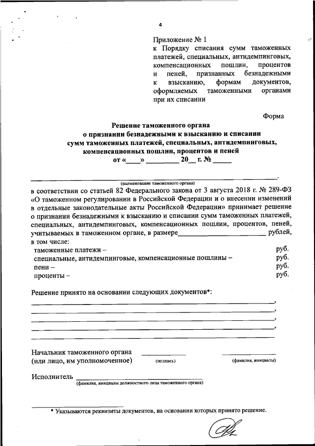 "ОБ УТВЕРЖДЕНИИ ПОРЯДКА СПИСАНИЯ СУММ ТАМОЖЕННЫХ ПЛАТЕЖЕЙ, СПЕЦИАЛЬНЫХ, АНТИДЕМПИНГОВЫХ, КОМПЕНСАЦИОННЫХ ПОШЛИН, ПРОЦЕНТОВ И ПЕНЕЙ, ПРИЗНАННЫХ БЕЗНАДЕЖНЫМИ К ВЗЫСКАНИЮ, ФОРМ ДОКУМЕНТОВ, ОФОРМЛЯЕМЫХ ТАМОЖЕННЫМИ ОРГАНАМИ ПРИ ИХ СПИСАНИИ, И ПЕРЕЧНЯ ДОКУМЕНТОВ, ПОДТВЕРЖДАЮЩИХ ОБСТОЯТЕЛЬСТВА ПРИЗНАНИЯ СУММ ТАМОЖЕННЫХ ПЛАТЕЖЕЙ, СПЕЦИАЛЬНЫХ, АНТИДЕМПИНГОВЫХ, КОМПЕНСАЦИОННЫХ ПОШЛИН, ПРОЦЕНТОВ И ПЕНЕЙ БЕЗНАДЕЖНЫМИ К ВЗЫСКАНИЮ"