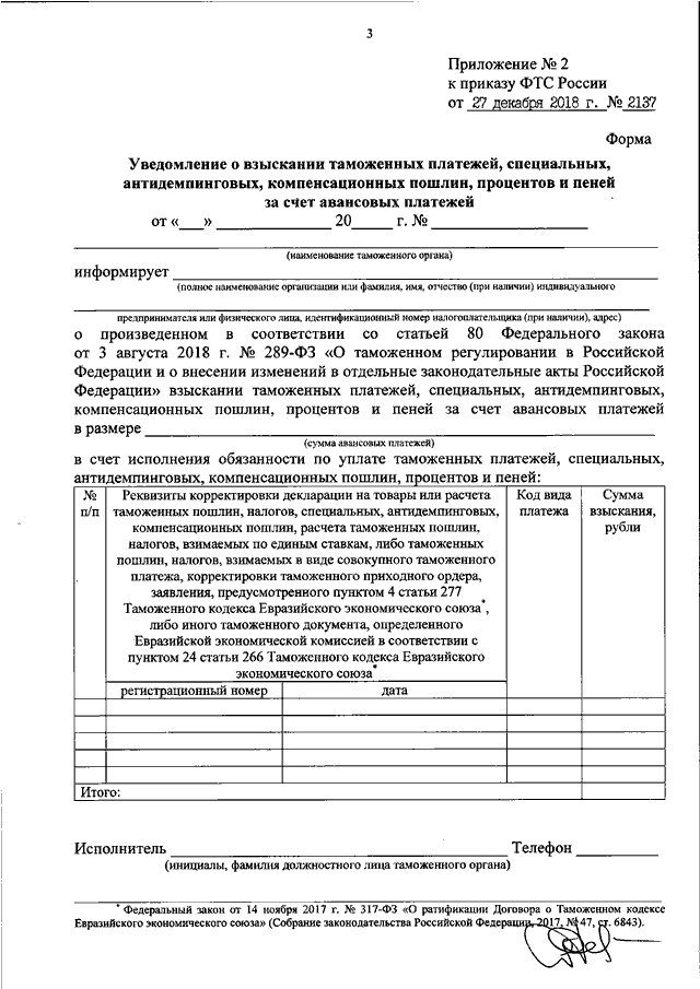 ПРИКАЗ ФТС РФ от 27.12.2018 N 2137