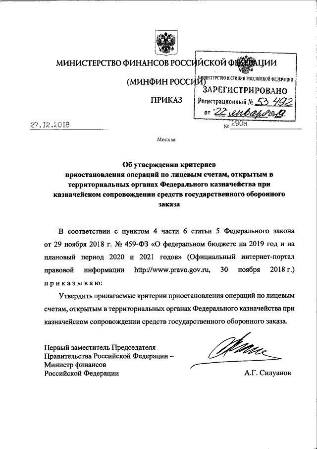 ПРИКАЗ Минфина РФ от 27.12.2018 N 290н