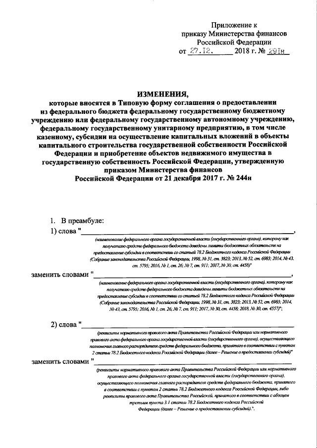 "О ВНЕСЕНИИ ИЗМЕНЕНИЙ В ТИПОВУЮ ФОРМУ СОГЛАШЕНИЯ О ПРЕДОСТАВЛЕНИИ ИЗ ФЕДЕРАЛЬНОГО БЮДЖЕТА ФЕДЕРАЛЬНОМУ ГОСУДАРСТВЕННОМУ БЮДЖЕТНОМУ УЧРЕЖДЕНИЮ ИЛИ ФЕДЕРАЛЬНОМУ ГОСУДАРСТВЕННОМУ АВТОНОМНОМУ УЧРЕЖДЕНИЮ, ФЕДЕРАЛЬНОМУ ГОСУДАРСТВЕННОМУ УНИТАРНОМУ ПРЕДПРИЯТИЮ, В ТОМ ЧИСЛЕ КАЗЕННОМУ, СУБСИДИИ НА ОСУЩЕСТВЛЕНИЕ КАПИТАЛЬНЫХ ВЛОЖЕНИЙ В ОБЪЕКТЫ КАПИТАЛЬНОГО СТРОИТЕЛЬСТВА ГОСУДАРСТВЕННОЙ СОБСТВЕННОСТИ РОССИЙСКОЙ ФЕДЕРАЦИИ И ПРИОБРЕТЕНИЕ ОБЪЕКТОВ НЕДВИЖИМОГО ИМУЩЕСТВА В ГОСУДАРСТВЕННУЮ СОБСТВЕННОСТЬ РОССИЙСКОЙ ФЕДЕРАЦИИ, УТВЕРЖДЕННУЮ ПРИКАЗОМ МИНИСТЕРСТВА ФИНАНСОВ РОССИЙСКОЙ ФЕДЕРАЦИИ ОТ 21 ДЕКАБРЯ 2017 Г. N 244Н"