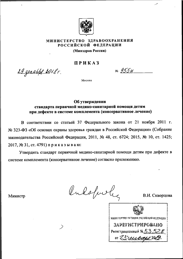 ПРИКАЗ Минздрава РФ от 29.12.2018 N 955н