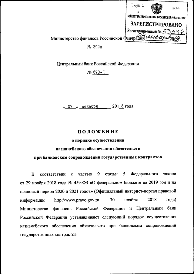 ПОЛОЖЕНИЕ Минфина РФ N 292н, ЦБ РФ N 670-П от 27.12.2018