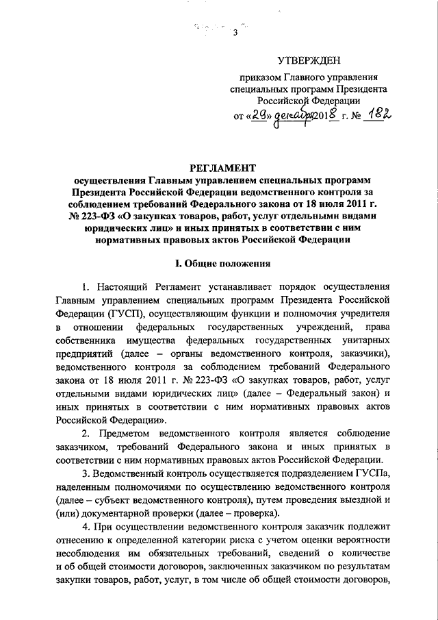 "ОБ УТВЕРЖДЕНИИ РЕГЛАМЕНТА ОСУЩЕСТВЛЕНИЯ ГЛАВНЫМ УПРАВЛЕНИЕМ СПЕЦИАЛЬНЫХ ПРОГРАММ ПРЕЗИДЕНТА РОССИЙСКОЙ ФЕДЕРАЦИИ ВЕДОМСТВЕННОГО КОНТРОЛЯ ЗА СОБЛЮДЕНИЕМ ТРЕБОВАНИЙ ФЕДЕРАЛЬНОГО ЗАКОНА ОТ 18 ИЮЛЯ 2011 Г. N 223-ФЗ "О ЗАКУПКАХ ТОВАРОВ, РАБОТ, УСЛУГ ОТДЕЛЬНЫМИ ВИДАМИ ЮРИДИЧЕСКИХ ЛИЦ" И ИНЫХ ПРИНЯТЫХ В СООТВЕТСТВИИ С НИМ НОРМАТИВНЫХ ПРАВОВЫХ АКТОВ РОССИЙСКОЙ ФЕДЕРАЦИИ"