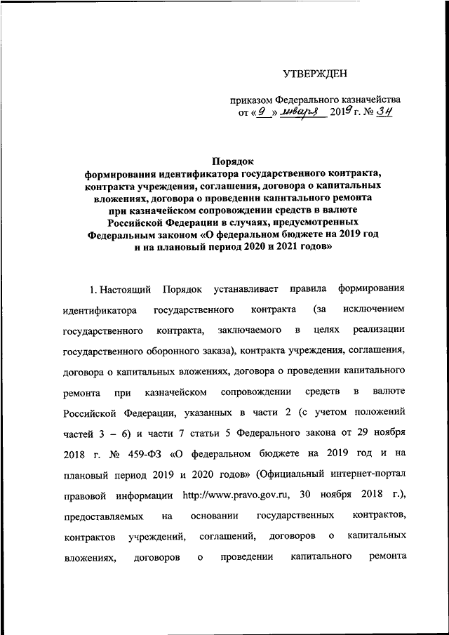 "ОБ УТВЕРЖДЕНИИ ПОРЯДКА ФОРМИРОВАНИЯ ИДЕНТИФИКАТОРА ГОСУДАРСТВЕННОГО КОНТРАКТА, КОНТРАКТА УЧРЕЖДЕНИЯ, СОГЛАШЕНИЯ, ДОГОВОРА О КАПИТАЛЬНЫХ ВЛОЖЕНИЯХ, ДОГОВОРА О ПРОВЕДЕНИИ КАПИТАЛЬНОГО РЕМОНТА ПРИ КАЗНАЧЕЙСКОМ СОПРОВОЖДЕНИИ СРЕДСТВ В ВАЛЮТЕ РОССИЙСКОЙ ФЕДЕРАЦИИ В СЛУЧАЯХ, ПРЕДУСМОТРЕННЫХ ФЕДЕРАЛЬНЫМ ЗАКОНОМ "О ФЕДЕРАЛЬНОМ БЮДЖЕТЕ НА 2019 ГОД И НА ПЛАНОВЫЙ ПЕРИОД 2020 И 2021 ГОДОВ"