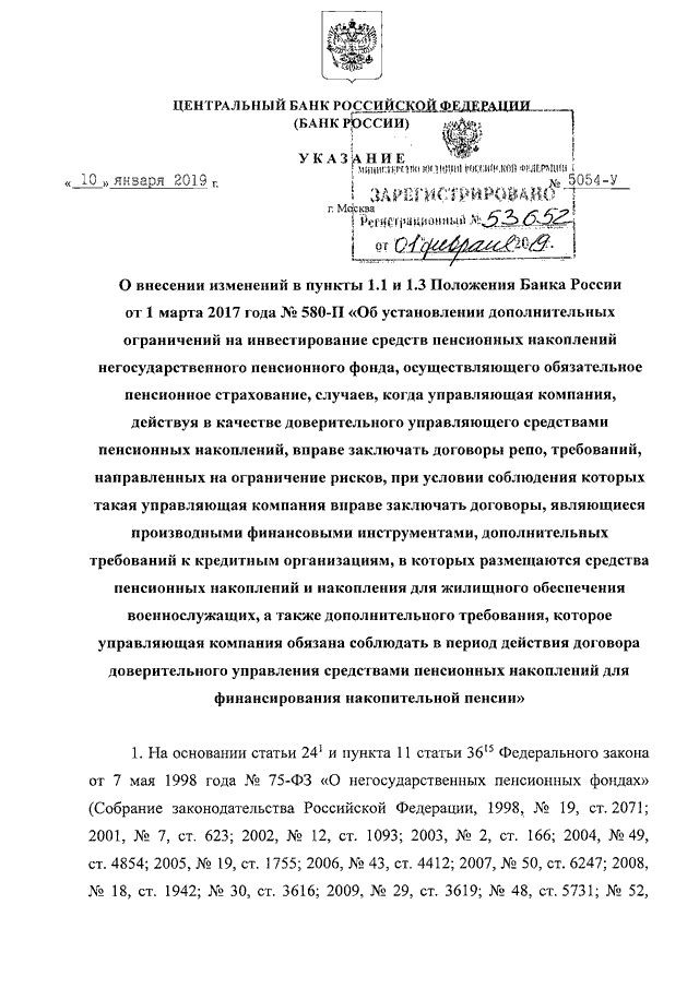УКАЗАНИЕ ЦБ РФ от 10.01.2019 N 5054-У