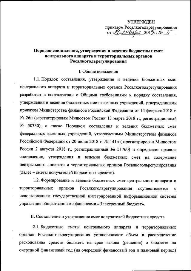 ПРИКАЗ Росалкогольрегулирования от 14.01.2019 N 5