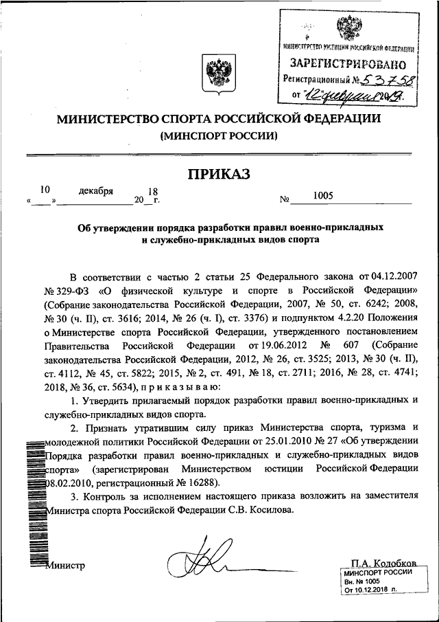 ПРИКАЗ Минспорта РФ от 10.12.2018 N 1005