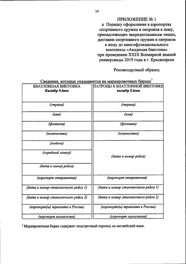 "ОБ УТВЕРЖДЕНИИ ПОРЯДКА ОФОРМЛЕНИЯ В АЭРОПОРТАХ СПОРТИВНОГО ОРУЖИЯ И ПАТРОНОВ К НЕМУ, ПРИНАДЛЕЖАЩИХ АККРЕДИТОВАННЫМ ЛИЦАМ, ДОСТАВКИ СПОРТИВНОГО ОРУЖИЯ И ПАТРОНОВ К НЕМУ ДО МНОГОФУНКЦИОНАЛЬНОГО КОМПЛЕКСА "АКАДЕМИЯ БИАТЛОНА" ПРИ ПРОВЕДЕНИИ XXIX ВСЕМИРНОЙ ЗИМНЕЙ УНИВЕРСИАДЫ 2019 ГОДА В Г. КРАСНОЯРСКЕ"