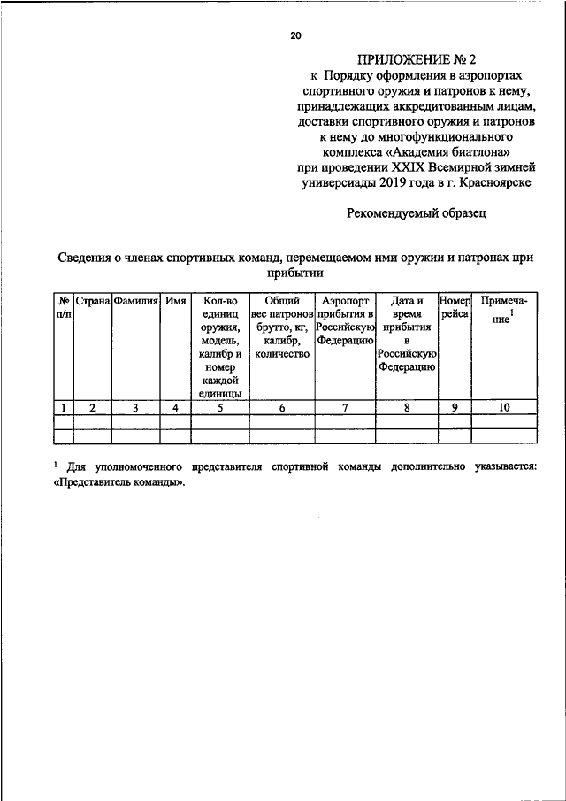 "ОБ УТВЕРЖДЕНИИ ПОРЯДКА ОФОРМЛЕНИЯ В АЭРОПОРТАХ СПОРТИВНОГО ОРУЖИЯ И ПАТРОНОВ К НЕМУ, ПРИНАДЛЕЖАЩИХ АККРЕДИТОВАННЫМ ЛИЦАМ, ДОСТАВКИ СПОРТИВНОГО ОРУЖИЯ И ПАТРОНОВ К НЕМУ ДО МНОГОФУНКЦИОНАЛЬНОГО КОМПЛЕКСА "АКАДЕМИЯ БИАТЛОНА" ПРИ ПРОВЕДЕНИИ XXIX ВСЕМИРНОЙ ЗИМНЕЙ УНИВЕРСИАДЫ 2019 ГОДА В Г. КРАСНОЯРСКЕ"