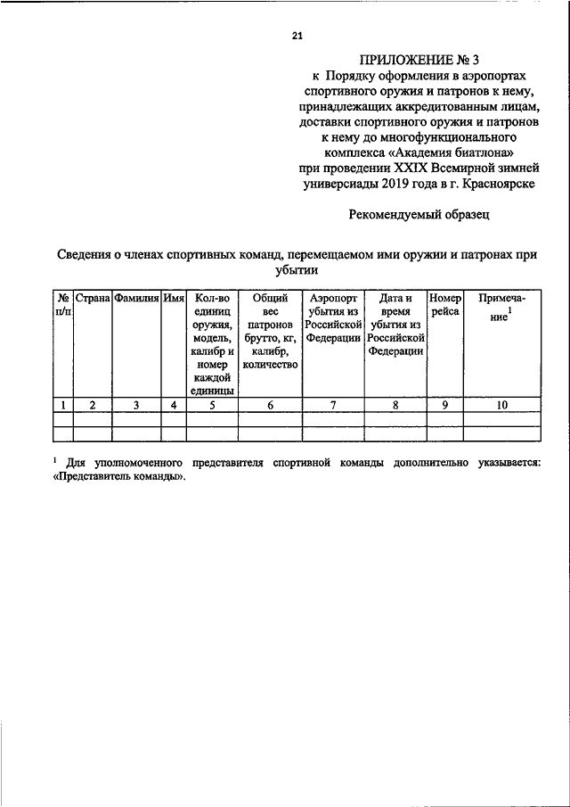 "ОБ УТВЕРЖДЕНИИ ПОРЯДКА ОФОРМЛЕНИЯ В АЭРОПОРТАХ СПОРТИВНОГО ОРУЖИЯ И ПАТРОНОВ К НЕМУ, ПРИНАДЛЕЖАЩИХ АККРЕДИТОВАННЫМ ЛИЦАМ, ДОСТАВКИ СПОРТИВНОГО ОРУЖИЯ И ПАТРОНОВ К НЕМУ ДО МНОГОФУНКЦИОНАЛЬНОГО КОМПЛЕКСА "АКАДЕМИЯ БИАТЛОНА" ПРИ ПРОВЕДЕНИИ XXIX ВСЕМИРНОЙ ЗИМНЕЙ УНИВЕРСИАДЫ 2019 ГОДА В Г. КРАСНОЯРСКЕ"