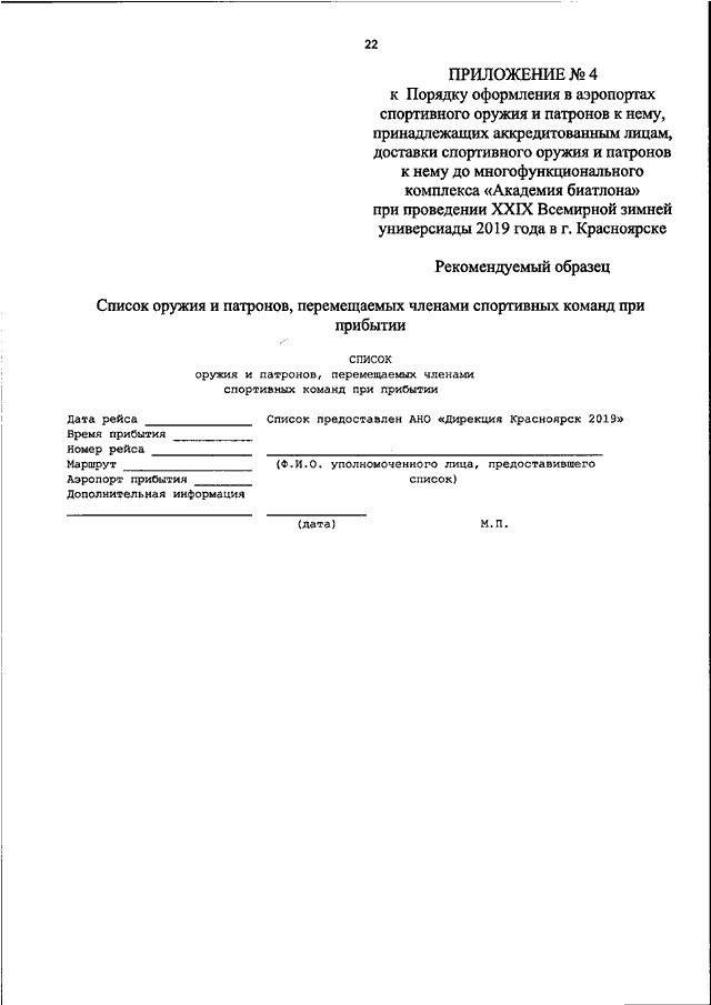 "ОБ УТВЕРЖДЕНИИ ПОРЯДКА ОФОРМЛЕНИЯ В АЭРОПОРТАХ СПОРТИВНОГО ОРУЖИЯ И ПАТРОНОВ К НЕМУ, ПРИНАДЛЕЖАЩИХ АККРЕДИТОВАННЫМ ЛИЦАМ, ДОСТАВКИ СПОРТИВНОГО ОРУЖИЯ И ПАТРОНОВ К НЕМУ ДО МНОГОФУНКЦИОНАЛЬНОГО КОМПЛЕКСА "АКАДЕМИЯ БИАТЛОНА" ПРИ ПРОВЕДЕНИИ XXIX ВСЕМИРНОЙ ЗИМНЕЙ УНИВЕРСИАДЫ 2019 ГОДА В Г. КРАСНОЯРСКЕ"