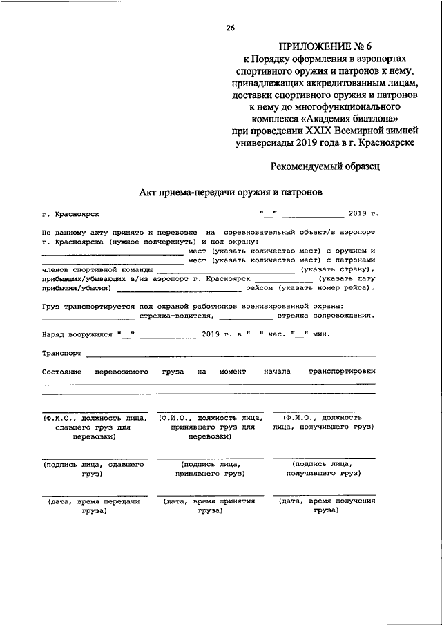 "ОБ УТВЕРЖДЕНИИ ПОРЯДКА ОФОРМЛЕНИЯ В АЭРОПОРТАХ СПОРТИВНОГО ОРУЖИЯ И ПАТРОНОВ К НЕМУ, ПРИНАДЛЕЖАЩИХ АККРЕДИТОВАННЫМ ЛИЦАМ, ДОСТАВКИ СПОРТИВНОГО ОРУЖИЯ И ПАТРОНОВ К НЕМУ ДО МНОГОФУНКЦИОНАЛЬНОГО КОМПЛЕКСА "АКАДЕМИЯ БИАТЛОНА" ПРИ ПРОВЕДЕНИИ XXIX ВСЕМИРНОЙ ЗИМНЕЙ УНИВЕРСИАДЫ 2019 ГОДА В Г. КРАСНОЯРСКЕ"