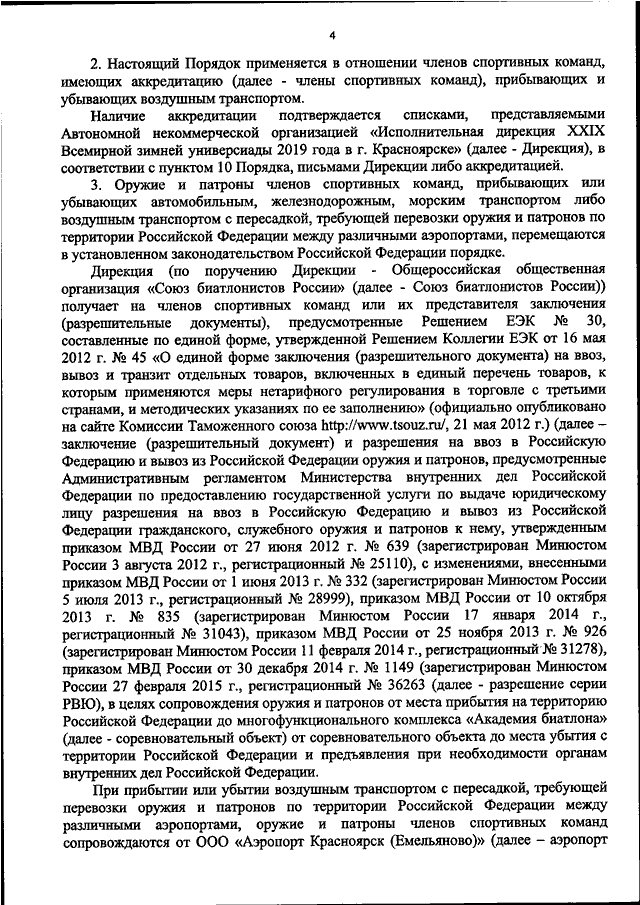 "ОБ УТВЕРЖДЕНИИ ПОРЯДКА ОФОРМЛЕНИЯ В АЭРОПОРТАХ СПОРТИВНОГО ОРУЖИЯ И ПАТРОНОВ К НЕМУ, ПРИНАДЛЕЖАЩИХ АККРЕДИТОВАННЫМ ЛИЦАМ, ДОСТАВКИ СПОРТИВНОГО ОРУЖИЯ И ПАТРОНОВ К НЕМУ ДО МНОГОФУНКЦИОНАЛЬНОГО КОМПЛЕКСА "АКАДЕМИЯ БИАТЛОНА" ПРИ ПРОВЕДЕНИИ XXIX ВСЕМИРНОЙ ЗИМНЕЙ УНИВЕРСИАДЫ 2019 ГОДА В Г. КРАСНОЯРСКЕ"