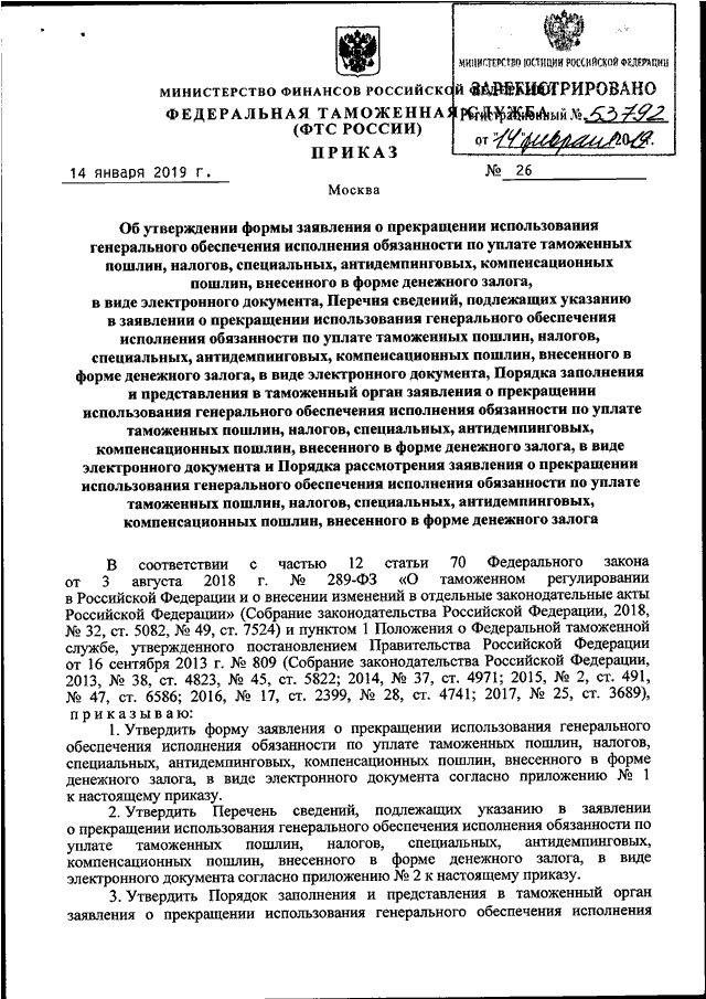 ПРИКАЗ ФТС РФ от 14.01.2019 N 26