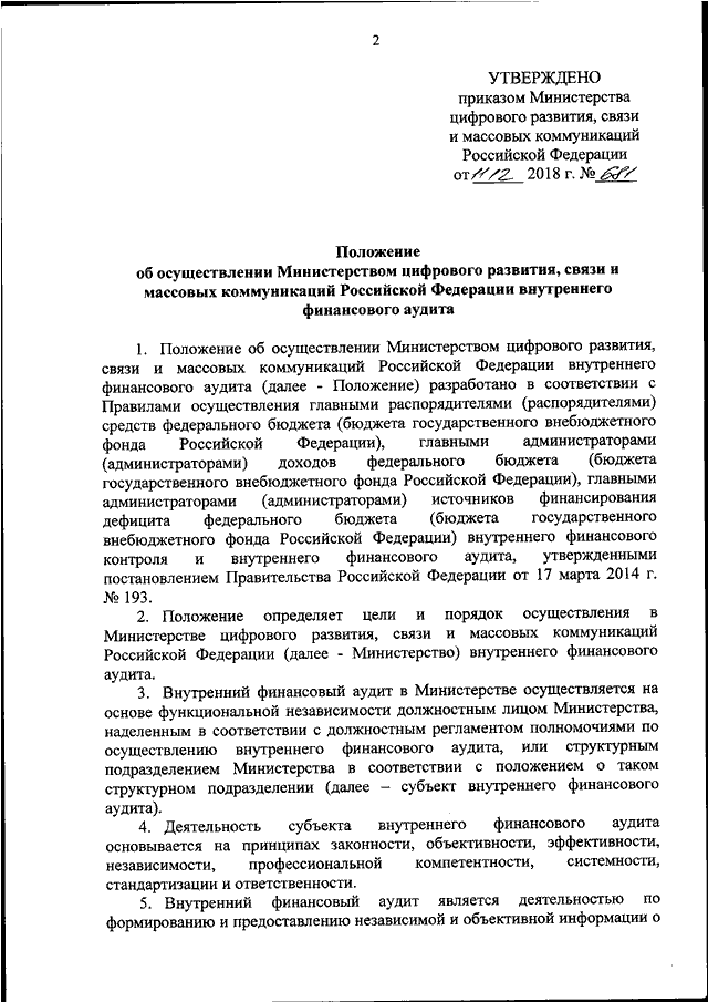 "ОБ УТВЕРЖДЕНИИ ПОЛОЖЕНИЯ ОБ ОСУЩЕСТВЛЕНИИ МИНИСТЕРСТВОМ ЦИФРОВОГО РАЗВИТИЯ, СВЯЗИ И МАССОВЫХ КОММУНИКАЦИЙ РОССИЙСКОЙ ФЕДЕРАЦИИ ВНУТРЕННЕГО ФИНАНСОВОГО АУДИТА"