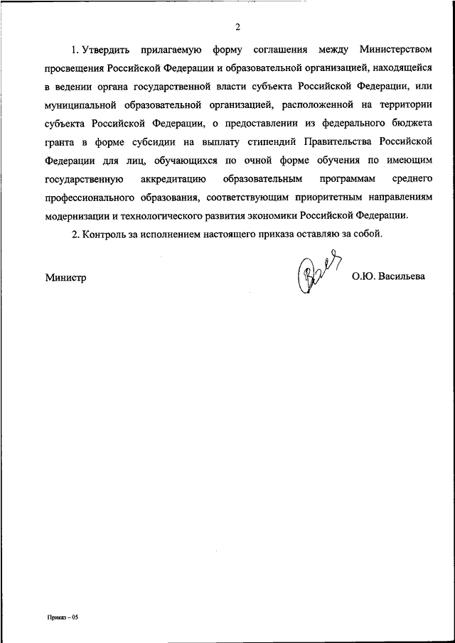 "ОБ УТВЕРЖДЕНИИ ФОРМЫ СОГЛАШЕНИЯ МЕЖДУ МИНИСТЕРСТВОМ ПРОСВЕЩЕНИЯ РОССИЙСКОЙ ФЕДЕРАЦИИ И ОБРАЗОВАТЕЛЬНОЙ ОРГАНИЗАЦИЕЙ, НАХОДЯЩЕЙСЯ В ВЕДЕНИИ ОРГАНА ГОСУДАРСТВЕННОЙ ВЛАСТИ СУБЪЕКТА РОССИЙСКОЙ ФЕДЕРАЦИИ, ИЛИ МУНИЦИПАЛЬНОЙ ОБРАЗОВАТЕЛЬНОЙ ОРГАНИЗАЦИЕЙ, РАСПОЛОЖЕННОЙ НА ТЕРРИТОРИИ СУБЪЕКТА РОССИЙСКОЙ ФЕДЕРАЦИИ, О ПРЕДОСТАВЛЕНИИ ИЗ ФЕДЕРАЛЬНОГО БЮДЖЕТА ГРАНТА В ФОРМЕ СУБСИДИИ НА ВЫПЛАТУ СТИПЕНДИЙ ПРАВИТЕЛЬСТВА РОССИЙСКОЙ ФЕДЕРАЦИИ ДЛЯ ЛИЦ, ОБУЧАЮЩИХСЯ ПО ОЧНОЙ ФОРМЕ ОБУЧЕНИЯ, ПО ИМЕЮЩИМ ГОСУДАРСТВЕННУЮ АККРЕДИТАЦИЮ ОБРАЗОВАТЕЛЬНЫМ ПРОГРАММАМ СРЕДНЕГО ПРОФЕССИОНАЛЬНОГО ОБРАЗОВАНИЯ, СООТВЕТСТВУЮЩИМ ПРИОРИТЕТНЫМ НАПРАВЛЕНИЯМ МОДЕРНИЗАЦИИ И ТЕХНОЛОГИЧЕСКОГО РАЗВИТИЯ ЭКОНОМИКИ РОССИЙСКОЙ ФЕДЕРАЦИИ"